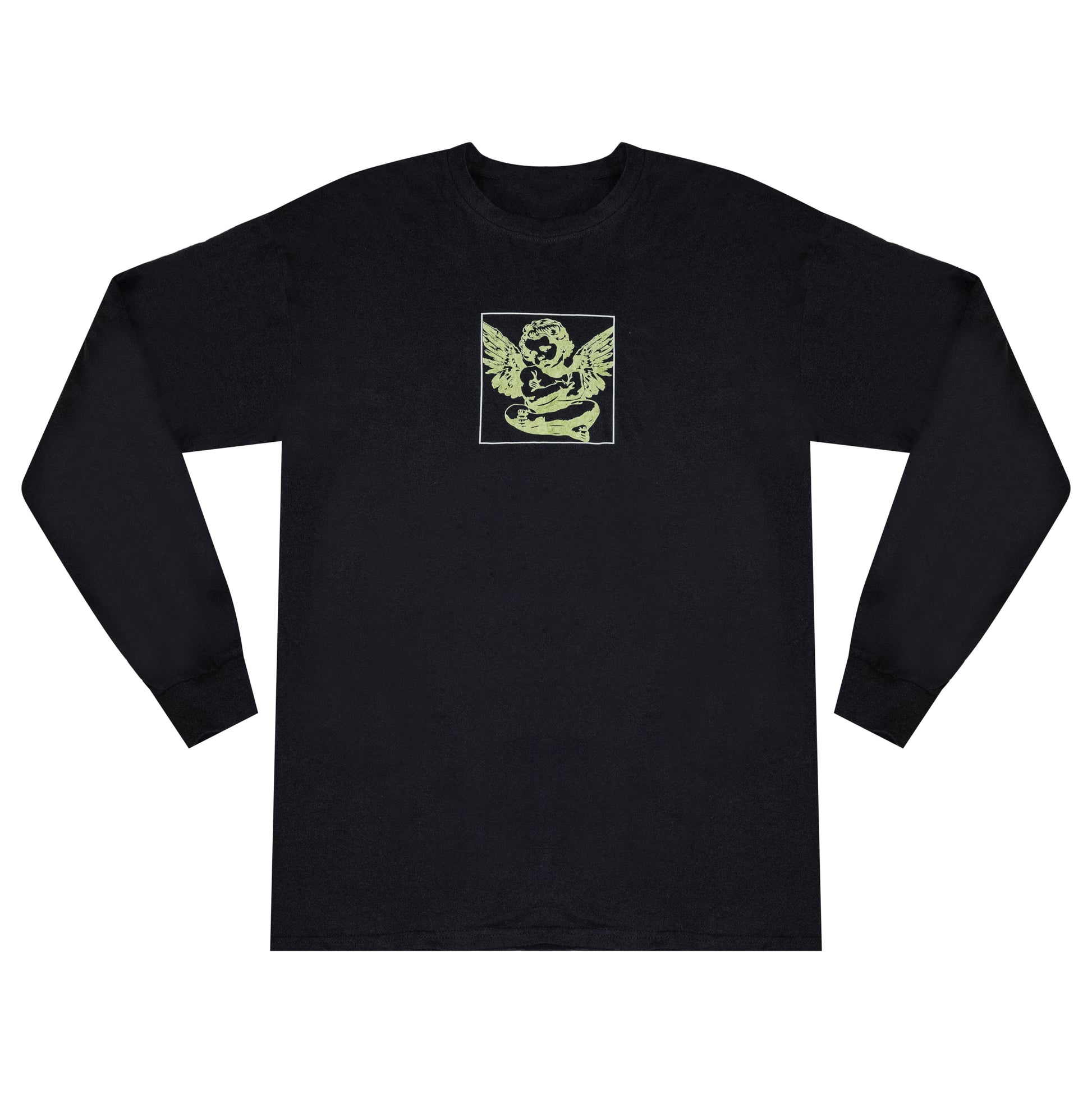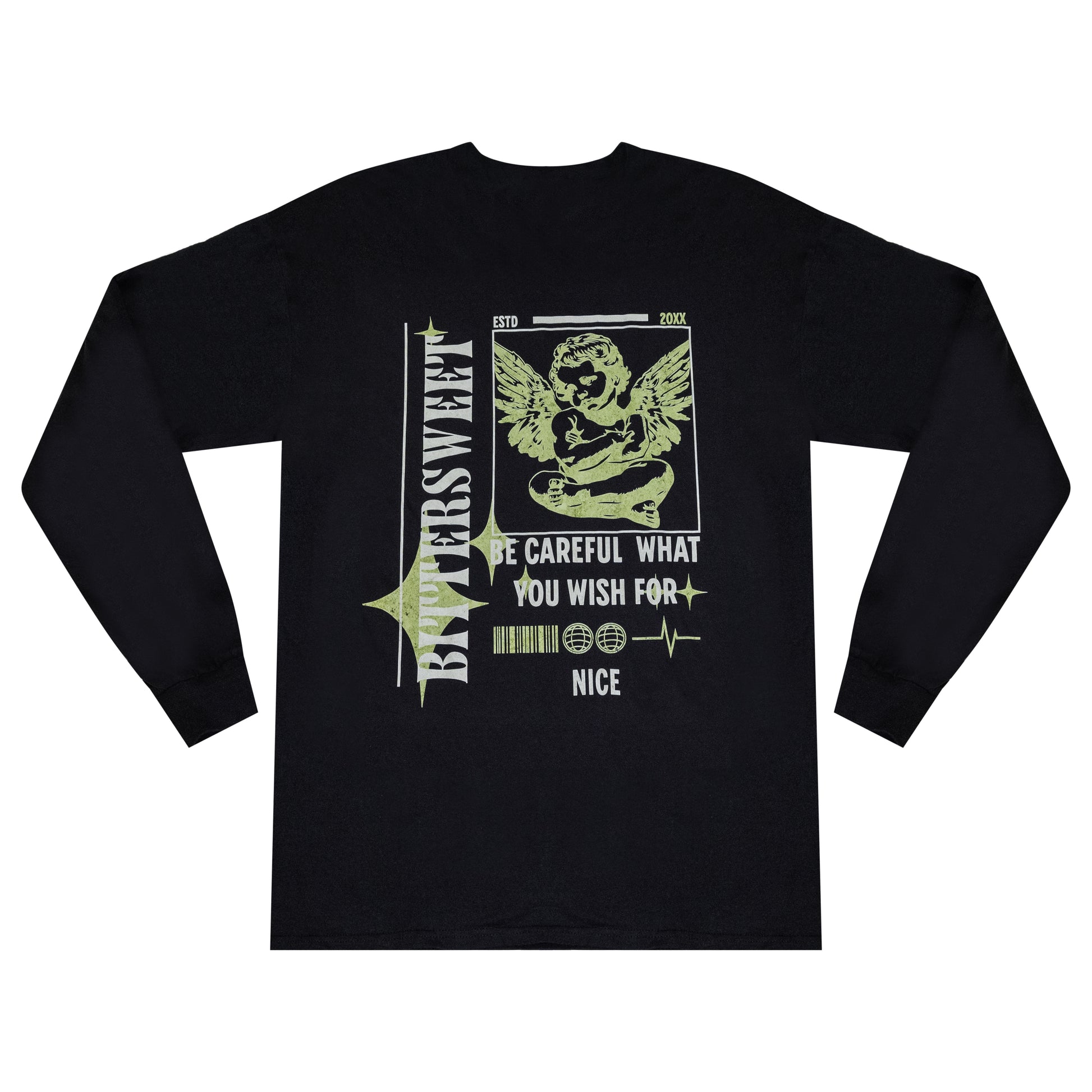 Elevate your streetwear game with the "Bittersweet Angel" Graphic Long Sleeve Tee. Designed for those who appreciate edgy style with a deeper meaning, this black long-sleeve shirt features striking neon green graphics on both the front and back. A detailed cherub angel with wings sits in the spotlight, framed alongside the bold text, “Be Careful What You Wish For,” and vertical "Bittersweet" branding. Minimalist symbols and sharp accents add a futuristic touch.