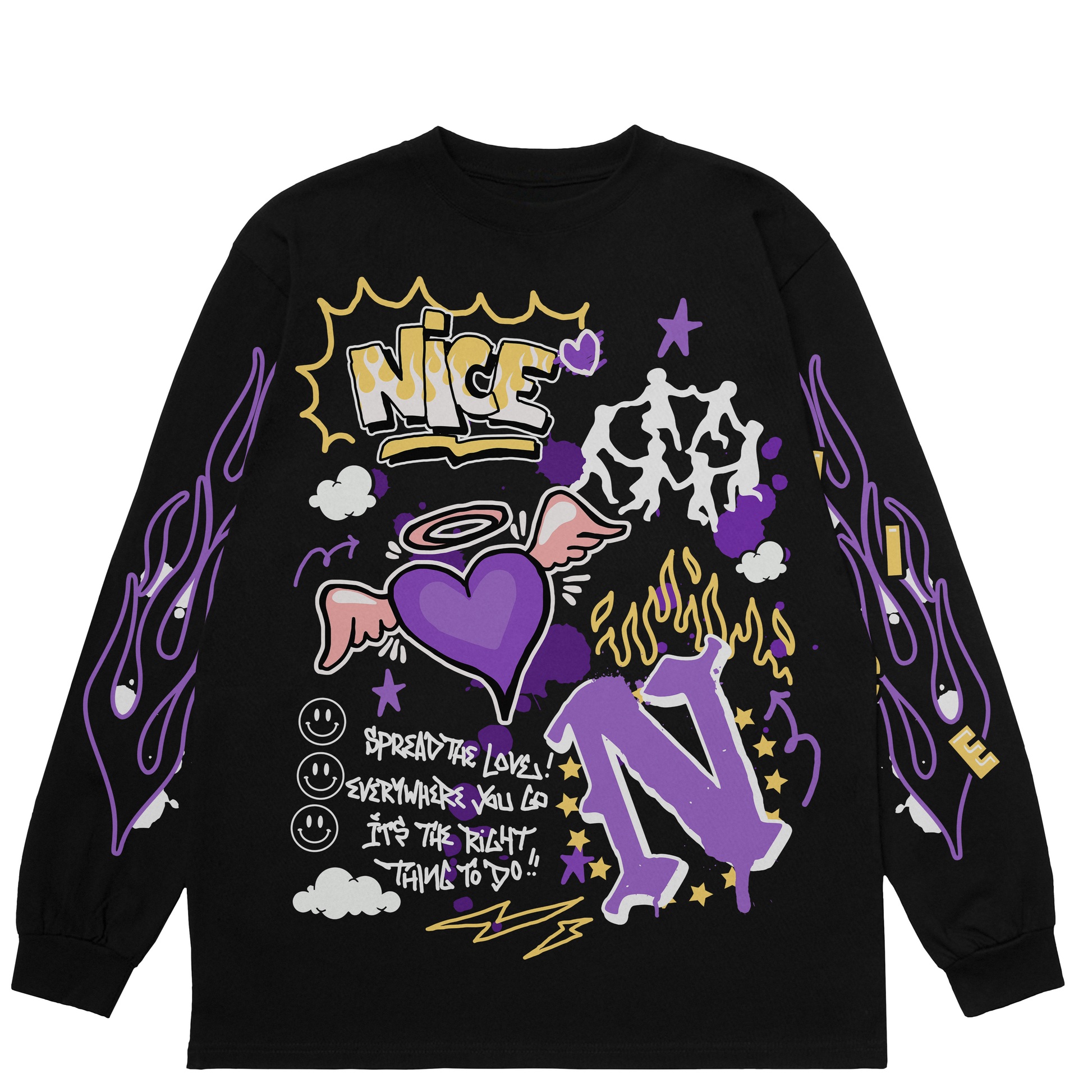 Elevate your streetwear game with this bold, graphic long-sleeve black sweatshirt. Featuring a vibrant mix of purple, yellow, and white designs, this shirt is a wearable statement of positivity and self-expression.